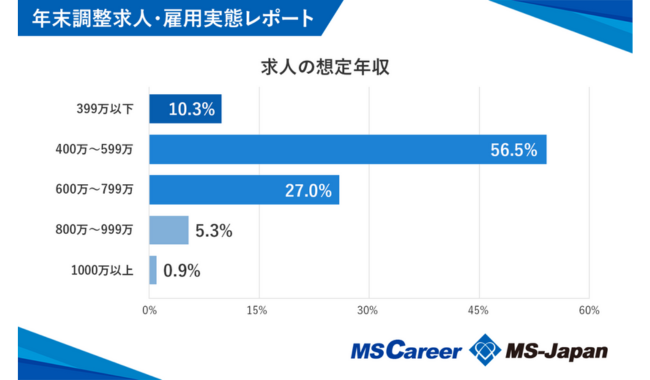 業務に年末調整が含まれる求人の想定年収平均は539万円となった。2021年10月~2022年9月のデータの513万円と比較すると、26万円増加していることが分かった。また、最も割合が多い年収帯は「400~599万」の56.5%と半数以上を占めていた。
