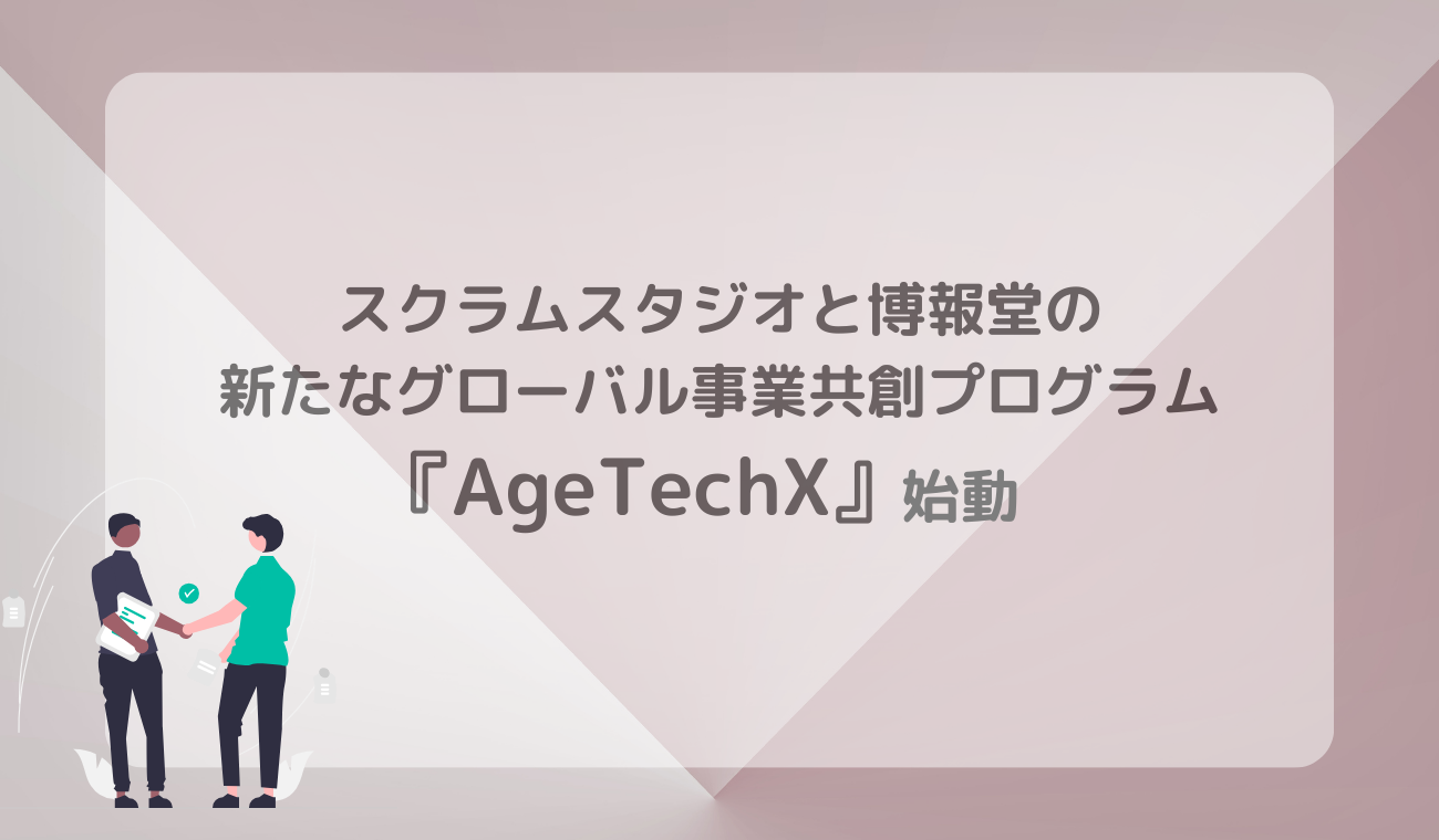 スクラムスタジオ株式会社(本社:東京都港区、代表取締役社長:髙橋正巳、以下スクラムスタジオ)と株式会社博報堂(本社:東京都港区、代表取締役社長:水島正幸、以下博報堂)は、パートナーとなる国内企業(以下パートナー企業)とともに”AgeTech(エイジテック)”にフォーカスした、世界中のスタートアップと連携・事業共創を行うグローバル事業共創プログラム『AgeTechX(エイジテックエックス)』を11月から開始すると発表した。