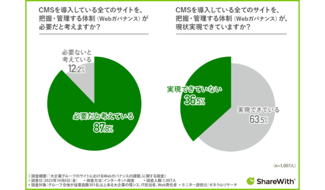 しかしながら、「CMSを導入している全てのサイトを、把握・管理する体制(Webガバナンス)が、現状実現できていますか?」と質問すると、『実現できていない』が36.5%となった。