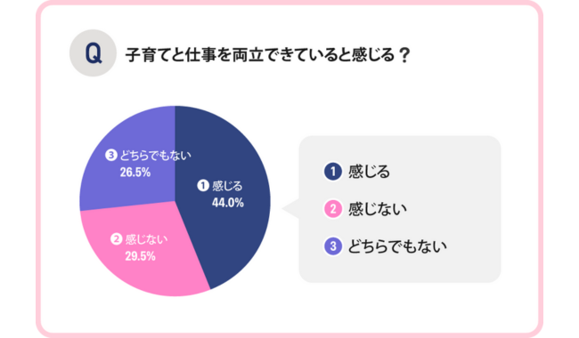 子育てと仕事を両立できていると感じているかの問いについては、「感じる」が44.0%と「感じない」の29.5%を大きく上回る結果となった。