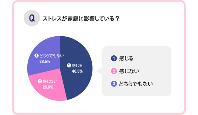ストレスが家庭に影響していると感じるかの問いについては、「感じる」が46.5%となった。一方、25.0%が「感じない」と答えており、4人に1人はストレスと上手に付き合っていることが分かる。