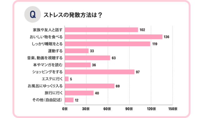 子育てと仕事の両立で感じたストレスの発散方法としては、「おいしい物を食べる」が19.9%と最も高い結果となった。続いて、「しっかり睡眠をとる」が17.4%、「家族や友人と話す」が15.0%と高い割合となっている。