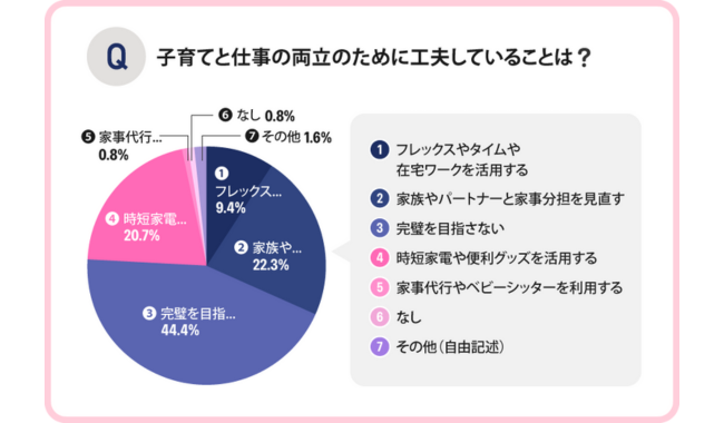 子育てと仕事の両立のために工夫していることは?の問いについては、「完璧を目指さない」が44.4%と最も高い結果となった。その他「家族やパートナーと家事分担を見直す」や「時短家電や便利グッズを活用する」も20%を超える高い結果となっている。