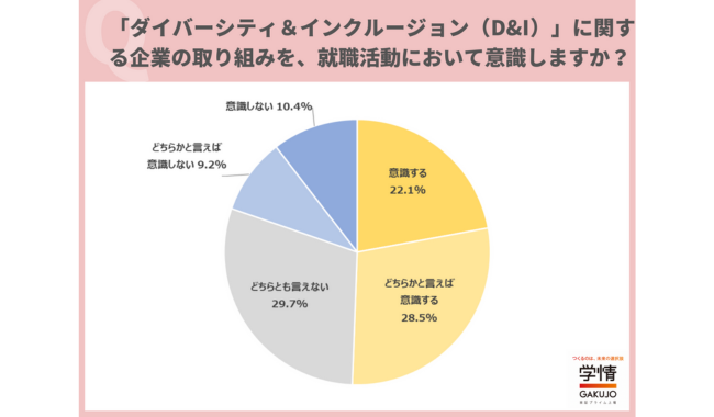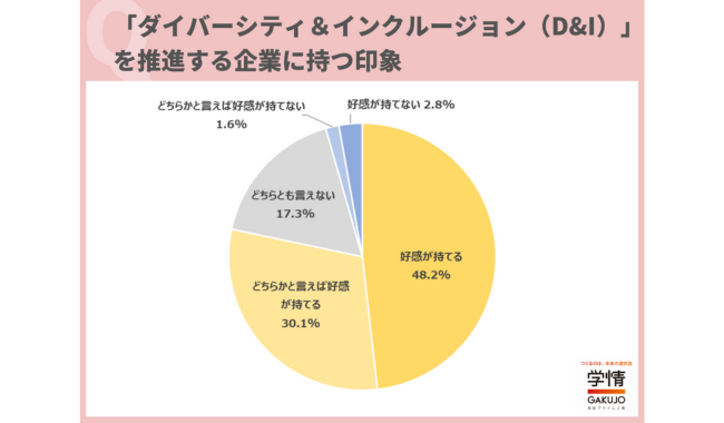株式会社学情(本社:東京都千代田区)は、2025年3月卒業(修了)予定の大学生・大学院生を対象に、インターネットアンケートを実施。今回は、「ダイバーシティ&インクルージョン(D&I)」について調査を実施。8割に迫る学生が、「ダイバーシティ&インクルージョン」を推進する企業は好感が持てると回答したことを明らかにした。