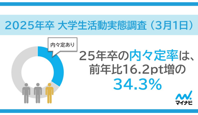 25年卒の内々定率は前年比16.2pt増の34.3%「マイナビ 2025年卒 大学生活動実態調査 (3月1日)」