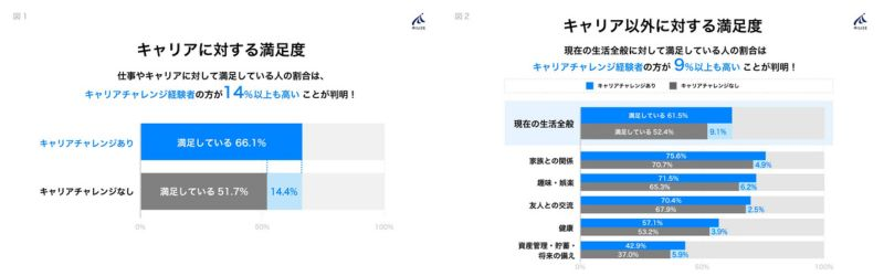 本調査ではまずはじめに「仕事・キャリアの面で現在の生活にどの程度満足していますか?」と質問。その結果、仕事・キャリアに対して満足している人の割合は、キャリアチャレンジ経験者が未経験者を14.4%も上回ることがわかった。