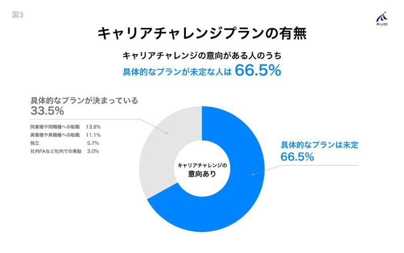 続いて本調査では、これからキャリアの転換期を迎える人たちに対して「今後、何らかのキャリアチャレンジをしたいと思っていますか?」と質問。その結果、66.5%が「具体的なプランは未定」と回答したという。