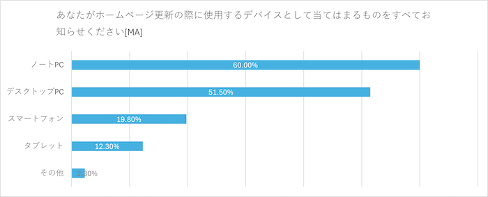 次に本調査では、ホームページを更新する際に使用しているデバイスについて調査。最も多いのは「ノートPC(60.0%)」で、次いで「デスクトップPC(51.5%)」が続いている。