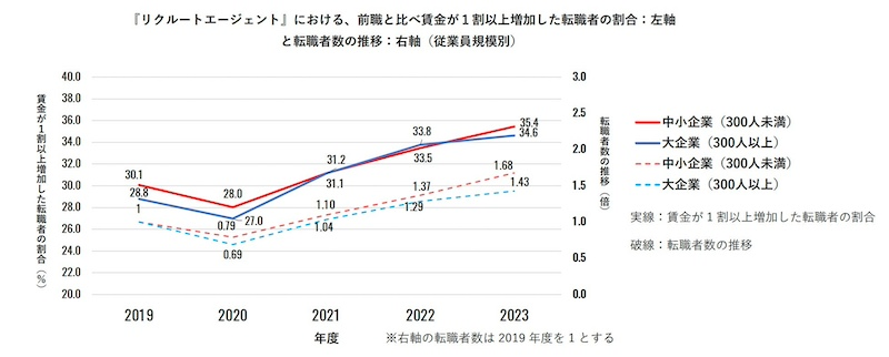 同社は『リクルートエージェント』のデータを分析した結果、2023年度の中小企業への転職者数は、2019年度の1.68倍と、大企業(1.43倍)の増加率を上回ったことを報告。さらに、中小企業への転職で1割以上賃金が増えた転職者の割合の推移は、2019年度の30.1%から、2023年度の35.4%まで上昇。直近では大企業と比べて賃金が増えた転職者の割合が高くなったという。