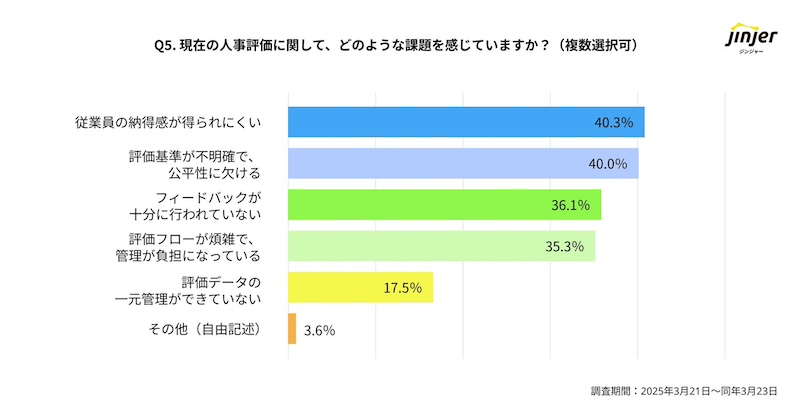 また本調査では、人事評価における課題に関して「従業員の納得感が得られにくい(40.3%)」「評価基準が不明確で、公平性に欠ける(40%)」「フィードバックが十分に行われていない(36.1%)」「評価フローが煩雑で管理が負担になっている(35.3)」との声が多く寄せられたという。