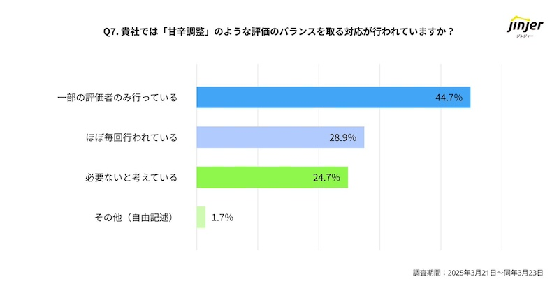 また、人事評価を行う際「甘辛調整」で評価のバランスを取る対応が行われているか尋ねる項目では「一部の評価者のみ行っている(44.7%)」「ほぼ毎回行われている(28.9%)」を合わせて、7割超が甘辛調整を実施している実態が判明している。