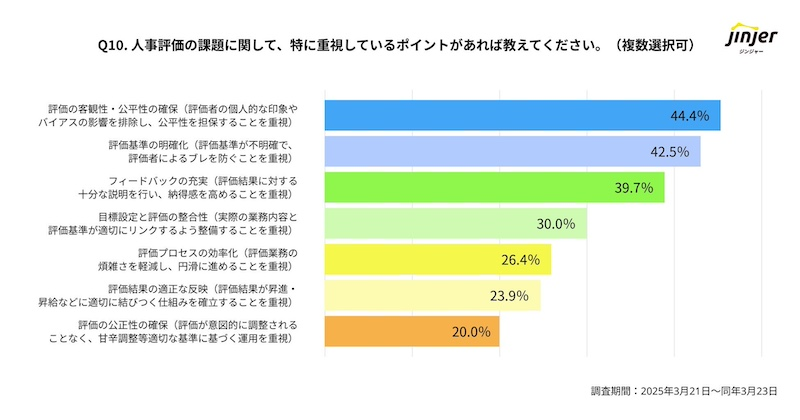 さらに本調査では、人事評価の課題に関して、特に重視しているポイントについて質問。その結果「評価の客観性・公平性の確保(評価者の個人的な印象やバイアスの影響を排除し、公平性を担保することを重視)(44.4%)「評価基準の明確化(評価基準が不明確で、評価者によるブレを防ぐことを重視)(42.5%)」「フィードバックの充実(評価結果に対する十分な説明を行い、納得感を高めることを重視)(39.7%)」が上位に挙げられたという。