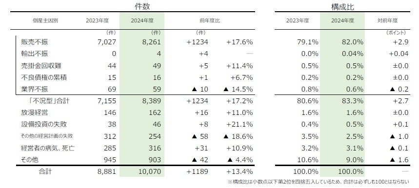 さらにTDBは、主因別の集計結果も報告している。全体の82.0%(対前年度2.9ポイント増)で最多となったのは「販売不振(前年度7027件→8261件、17.6%増)」だったという。なお「売掛金回収難(同44件→49件、11.4%増)」や「不良債権の累積(同15件→16件、6.7%増)」などを含めた『不況型倒産』の合計は8389件(同7155件、17.2%増)と報告された。