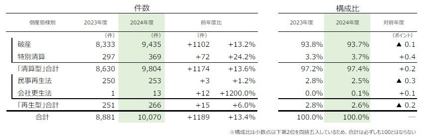続いてTDBは、倒産態様別の集計結果を報告しており『清算型』倒産の合計が9804件(前年度8630件、13.6%増)となったことを明らかにした。構成比は2000年度以降で最も高くなり、全体の97.4%を占めたという。『再生型』倒産は266件(同251件、6.0%増)発生している。