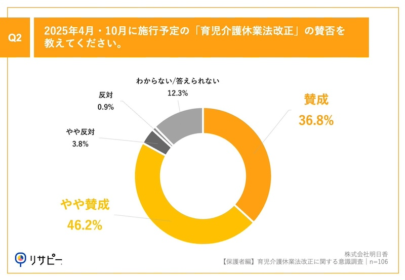 続いて「Q2.2025年4月・10月に施行予定の「育児介護休業法改正」の賛否を教えてください。」との質問には「賛成(36.8%)」「やや賛成(46.2%)」と、約8割が肯定的な回答を示したという。