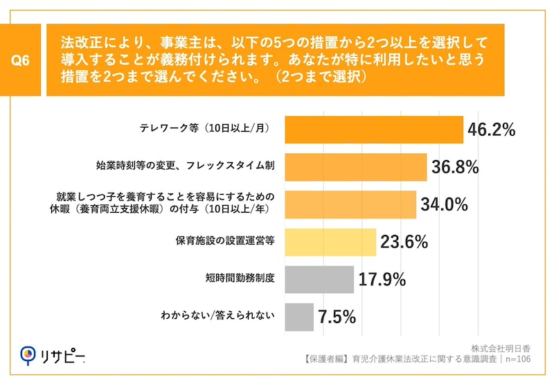 次に本調査では「Q6.法改正により、事業主は3歳~小学校入学前の子を養育する労働者向けに、以下の5つの措置から2つ以上を選択して導入することが義務付けられます。あなたが特に利用したいと思う措置を2つまで選んでください。(2つまで選択)」と質問。