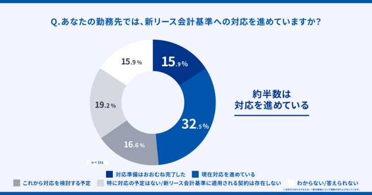 また、新リース会計基準の対応状況については「対応準備はおおむね完了した(15.9%)」「現在対応を進めている(32.5%)」との回答が寄せられており、合わせて約半数の企業で既に対応が進んでいることが明らかになった。