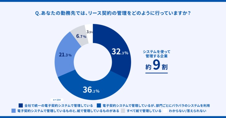 なお、勤務先におけるリース契約の管理方法については「全社で統一の電子契約システムで管理している(32.3%)」「電子契約システムで管理しているが部門ごとにバラバラのシステムを利用(36.2%)」「電子契約システムで管理しているものと、紙で管理しているものがある(21.3%)」を合わせて約9割がシステムを利用していることが判明している。