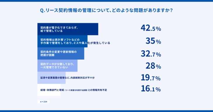 同社は続いて、リース契約情報の管理における課題について調査。最も多かった回答は「契約書が電子化できておらず、紙で管理している(42.5%)」で、次いで「契約情報は表計算ソフトなどの手作業で管理しており、ミスや属人化が発生している(35%)」「契約条件の変更や更新情報の把握が困難(32.7%)」と、アナログな契約管理が原因の課題が上位に挙げられたことを報告した。