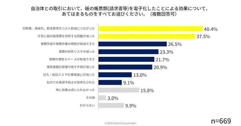 何らかの帳票類を電子化した経験のある地域事業者からは、コストの削減や業務の効率化に効果があったとの声も寄せられた。自治体との取り引きにおいて電子化を進めることで、地域事業者が得られるメリットは大きいようだ。