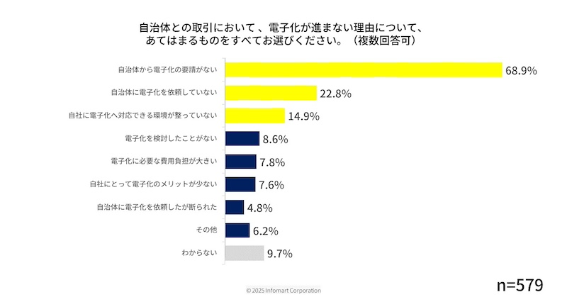 続いて本調査では、全ての帳票において「紙でやり取りしている」を選択した地域事業者に自治体の取り引きで電子化が進まない理由について質問。「自治体からの電子化の要請がない(68.9%)」が最多となり、次いで「自治体に電子化を依頼していない(22.8%)」「自社に電子化へ対応できる環境が整っていない(14.9%)」が続いたという。