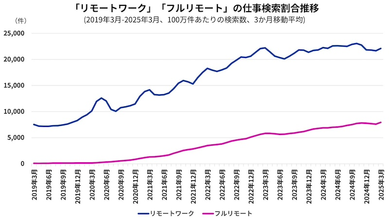 さらに同社は、直近では「フルリモート」への求職者の興味関心が高まっていると報告。仕事検索割合は、2019年から2025年の6年間で90.9倍と大きく拡大したという。2025年3月時点では、検索数全体の0.8%を占める検索割合を示したことも明らかになった。なお「フルリモート」は2023年以降も右肩上がりで伸長しており、直近1年間でも1.1倍に増加している。