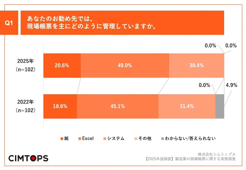 株式会社シムトップス(本社:東京都品川区、代表取締役:水野貴司)は、製造業(従業員数50名以上)で現場帳票を管理している102名を対象に【2025年版調査】製造業の現場帳票に関する実態調査を実施。2022年版の同内容調査と比較して結果を発表した。