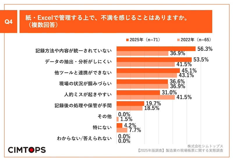 一方では「Q4.紙・Excelで管理する上で、不満を感じることはありますか。(複数回答)」との質問に「記録方法や内容が統一されていない(56.3%)」「データの抽出・分析がしにくい(53.5%)」「他ツールと連携ができない(45.1%)」といった声が寄せられたことも明らかになっている。
