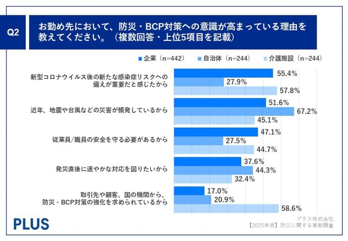 プラス株式会社(本社:東京都港区、代表取締役社長:今泉忠久)は、従業員数10名以上の企業で防災・BCP対策に関わっている経営者・総務担当者516名、防災課(危機管理課)に所属している自治体職員310名、介護施設の経営者・施設長・ホーム長・管理者315名を対象に【2025年版】防災に関する実態調査を実施した。