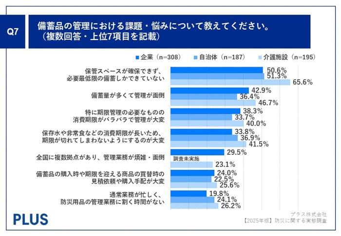 出典元:【相次ぐ大規模災害】企業の約9割、自治体・介護施設の約8割が、「防災・BCP対策への意識の高まり」を実感 備蓄品管理では、「保管スペース不足で、必要最低限の備蓄のみ」の課題も(プラス株式会社ジョインテックスカンパニー)