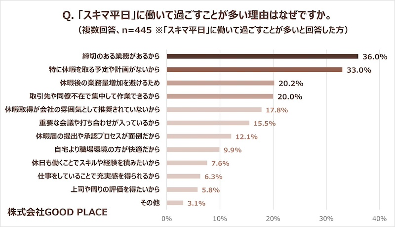 また「スキマ平日」に働く理由としては「締切のある業務があるから(36.0%)」「特に休暇を取る予定や計画がないから(33.0%)」が上位に挙げられたという。意欲的に勤務しているというより、業務上の都合や予定に合わせて働くことを選択している人が多いようだ。一方で「休暇後の業務量増加を避けるため(20.2%)」「取引先や同僚不在で集中して作業できるから(20.0%)」といった回答も一定数みられており「スキマ平日」を効率的に働けるチャンスと捉えている人も少なくないと考えられる。