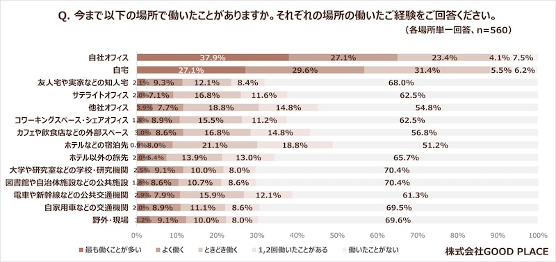 続いて本調査では、実際に働いたことのある場所とその頻度について質問。その結果、最も働くことが多い場所としては「自社オフィス(37.9%)」「自宅(27.1%)」が上位に。
