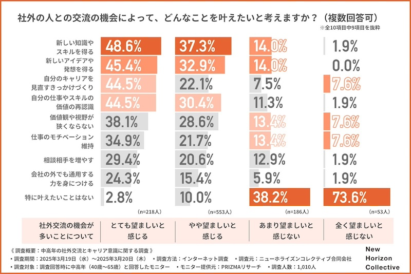 ニューホライズンコレクティブ合同会社(本社:東京都港区、代表:山口裕二、野澤友宏)は、中高年(40歳〜65歳)を対象に「中高年の社外交流とキャリア意識」に関する調査を実施。かつての終身雇用や年功序列が薄れ、社外との接点や新しい知見の獲得が、キャリア継続や自己成長のカギとなる場面が増えているとして、中高年の社外交流について実態を明らかにした。