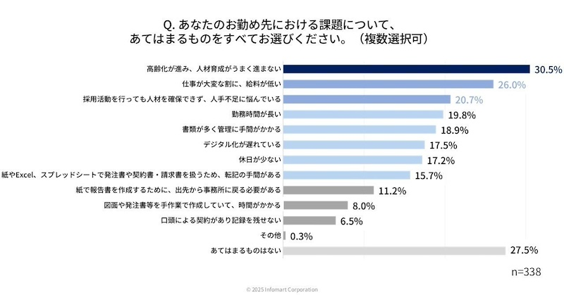 株式会社インフォマート(本社:東京都港区 代表取締役社長:中島健)は、建設業に従事している会社員338名を対象に、超高齢社会により人材不足が深刻化する「2025年問題」に関する実態調査を実施。建設業における今の課題や2025年問題への取り組み状況を明らかにした。
