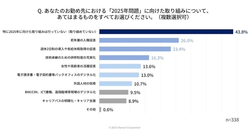 一方で、2025年問題に向けた取り組み状況については「特に2025年に向けた取り組みは行っていない(取り組めていない)(43.8%)」が最多となっている。