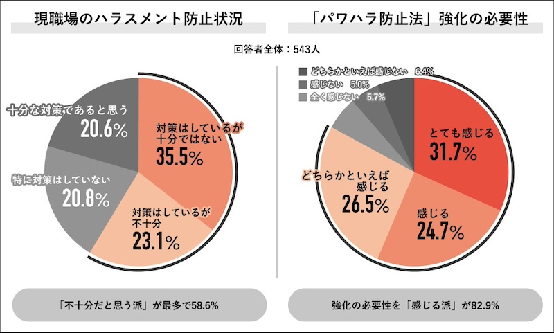 また、現職場のハラスメント防止対策への印象については「不十分だと思う派(58.6%)」が過半数となったことが判明。「パワハラ防止法」強化の必要性についても「必要性を感じる派(82.9%)」が大多数を占めたという。