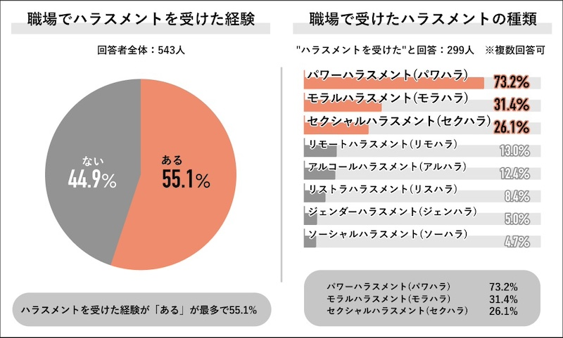 続いて本調査では、職場でのハラスメント被害について質問。被害を受けた経験が「ある(55.1%)」と回答した人が過半数を占めたことが明らかになった。受けたハラスメントの種類としては「パワーハラスメント(パワハラ)(73.2%)」「モラルハラスメント(モラハラ)(31.4%)」「セクシュアルハラスメント(セクハラ)(26.1%)」が多いようだ。