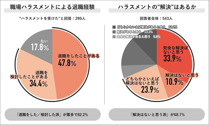 さらに本調査では、被害経験ありと回答した299人に、職場ハラスメントによる退職・検討経験を尋ねており「ある派(82.2%)」が大多数を占めたという。そのうち47.8%は実際に退職したことも明らかになった。また、回答者全体の543人を対象とした「ハラスメントが解決されることはあるか」を尋ねる項目では「解決はないと思う派(68.7%)」が7割近くに及ぶ結果となっている。