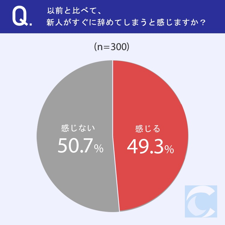 以前と比べて新人がすぐに辞めてしまうと「感じる」人は約半数