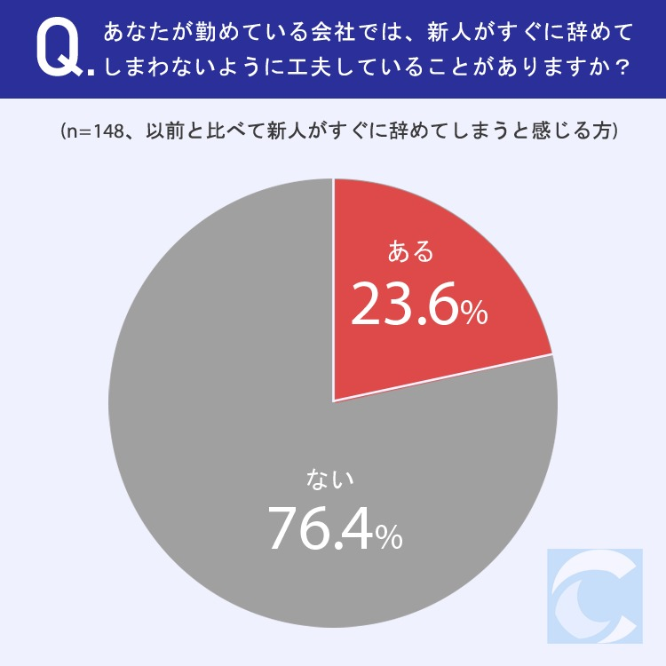 最後に本調査では、勤めている会社で新人がすぐに辞めてしまわないように工夫していることがあるかについて質問。その結果「ある」と回答した人は23.6%と少数派であることが判明した。実際に取り組んでいる工夫として寄せられたコメントを一部紹介する。