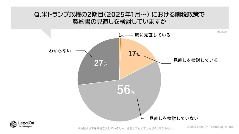 株式会社LegalOn Technologies(本社:東京都渋谷区、代表取締役 執行役員・CEO:角田望)は、海外企業との契約・取引を実施している企業担当者144名に「米国の関税措置に対する契約書の見直しに関するアンケート」を実施した。昨今、米国による関税政策や対中国追加関税措置を含む貿易政策の変動により、契約条項の見直しやリスク管理の重要性が高まる中、企業が実際にどのような対応を取っているのか探っている。