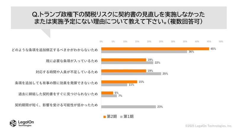 逆に、トランプ政権の1期目、2期目の関税政策に対し、契約書の見直しを実施していないと回答した企業においては「どのような条項を追加修正するべきかがわからないため(1期目:45%、2期目:36%)」との理由が最も多く挙げられている。
