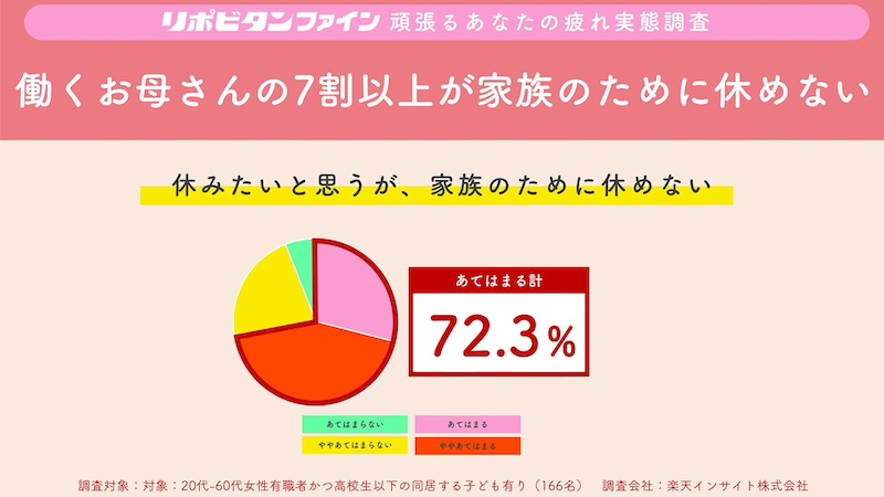 本調査では、働くお母さんに疲労の実態を尋ねており「疲れを感じることは多いが、特に対処できていない」にあてはまると回答した人が92.1%にものぼったという。また「休みたいと思うが、家族のために休めない」にあてはまるとした人は72.3%となったことが報告されている。
