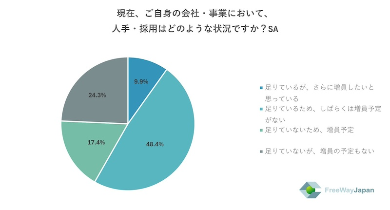 次に同社は、人手・採用の状況について質問。全体では「足りているためしばらくは増員予定がない(48.4%)」との回答が最多になったという。次いで「足りていないが、増員の予定もない(24.3%)」「足りていないため、増員予定(17.4%)」「足りているが、さらに増員したいと思っている(9.9%)」が続いている。