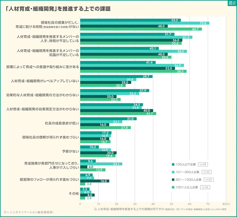 次に本調査では、人材育成・組織開発を推進する上で具体的にどのような課題があるのか質問。100人以下企業、101~300人企業、1001人以上企業では「現場社員の現業が忙しく、育成に割ける時間(育成施策を受ける時間)がない」の回答が最も多く、それぞれ55.2%、70.8%、66.7%が回答したという。301~1000人企業では「人材育成・組織開発を推進するメンバーの人手、時間が不足している(56.0%)」が最も多い回答となり、従業員規模に関わらず、人や時間のリソース不足に関する課題がトップを占めていることがわかった。