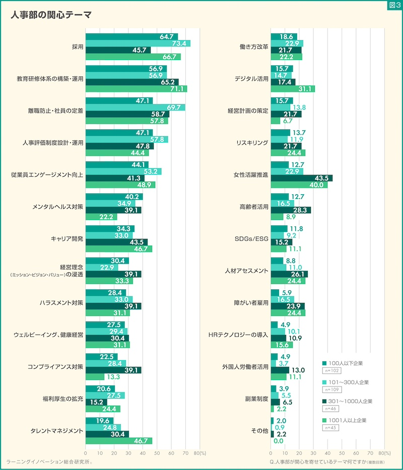 続いて本調査では、人事部が関心を寄せているテーマについて質問。その結果、100人以下企業、101~300人企業は「採用」が、301~1000人企業、1001人以上企業では「教育研修体系の構築・運用」がそれぞれトップになったという。