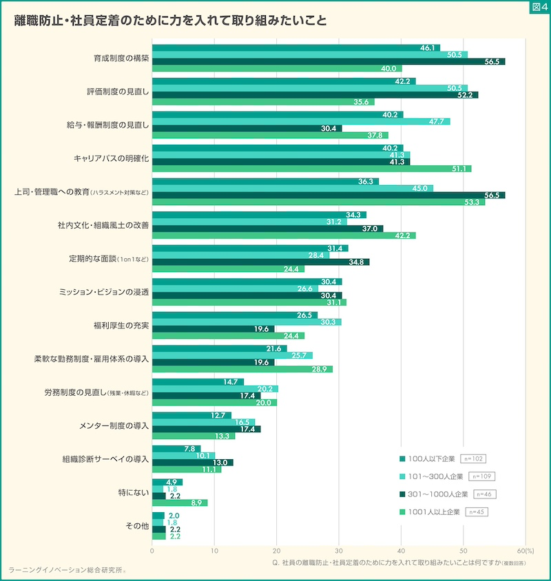 出典元:【人事部の意識調査(人と組織の課題編)】社員の離職防止のために取り組みたいこと、大企業が「管理職の教育」がトップ、中小企業は「育成制度の構築」「評価制度の見直し」が上位(ALL DIFFERENT株式会社)