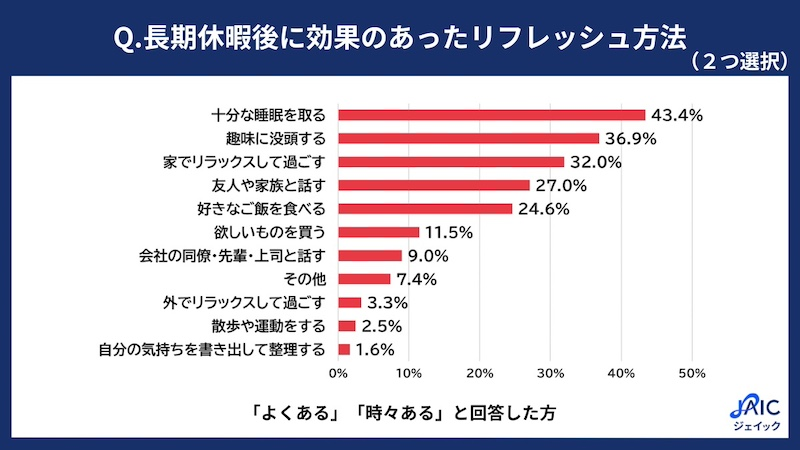 続いて本調査では、長期休暇後の気分の落ち込みが「よくある」「時々ある」と回答した人を対象に、効果のあったリフレッシュ方法について質問。「十分な睡眠を取る(43.4%)」「趣味に没頭する(36.9%)」「家でリラックスして過ごす(32.0%)」「友人や家族と話す(27.0%)」「好きなご飯を食べる(24.6%)」などが高い回答割合を示したという。