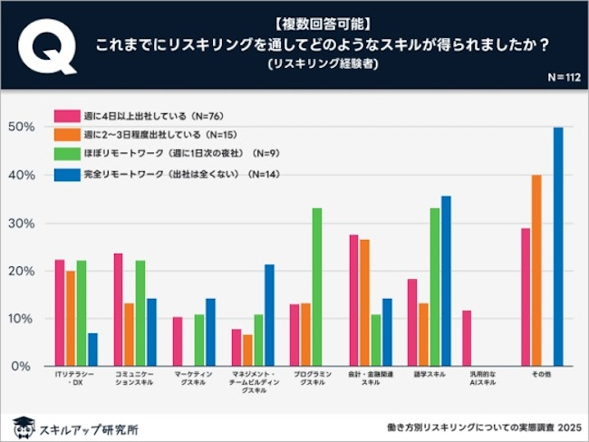 一方で、リスキリングを通して得られたスキルの種類については、働き方による違いがみられたことが報告されている。出社中心の人では会計・金融スキルを習得した割合がリモート中心の人よりも高く、リモート中心の人では語学スキルを習得した割合が高いという。