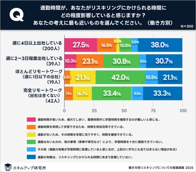 同社は「通勤時間の有無による学習時間への影響」についても調査。出社中心の人は「通勤による疲労」が学習時間の確保を困難にしていると感じる傾向にあることが判明した。一方で、リモート中心の人では「通勤はないものの、他の事情(家事や育児など)により、学習時間を十分に確保できていない」との回答割合が4割を超えている。また、全ての働き方において「通勤の有無はリスキリングにかけられる時間にあまり影響していない」と回答したことも明らかになった。
